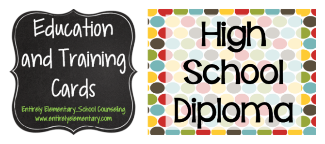 These are the Education and Training card printables that go along with Entirely Elementary...School Counseling's Career Awareness Lesson #2! These 5 cards/signs are 8.5" by 11". Visit www.entirelyelementary.com for the lesson!